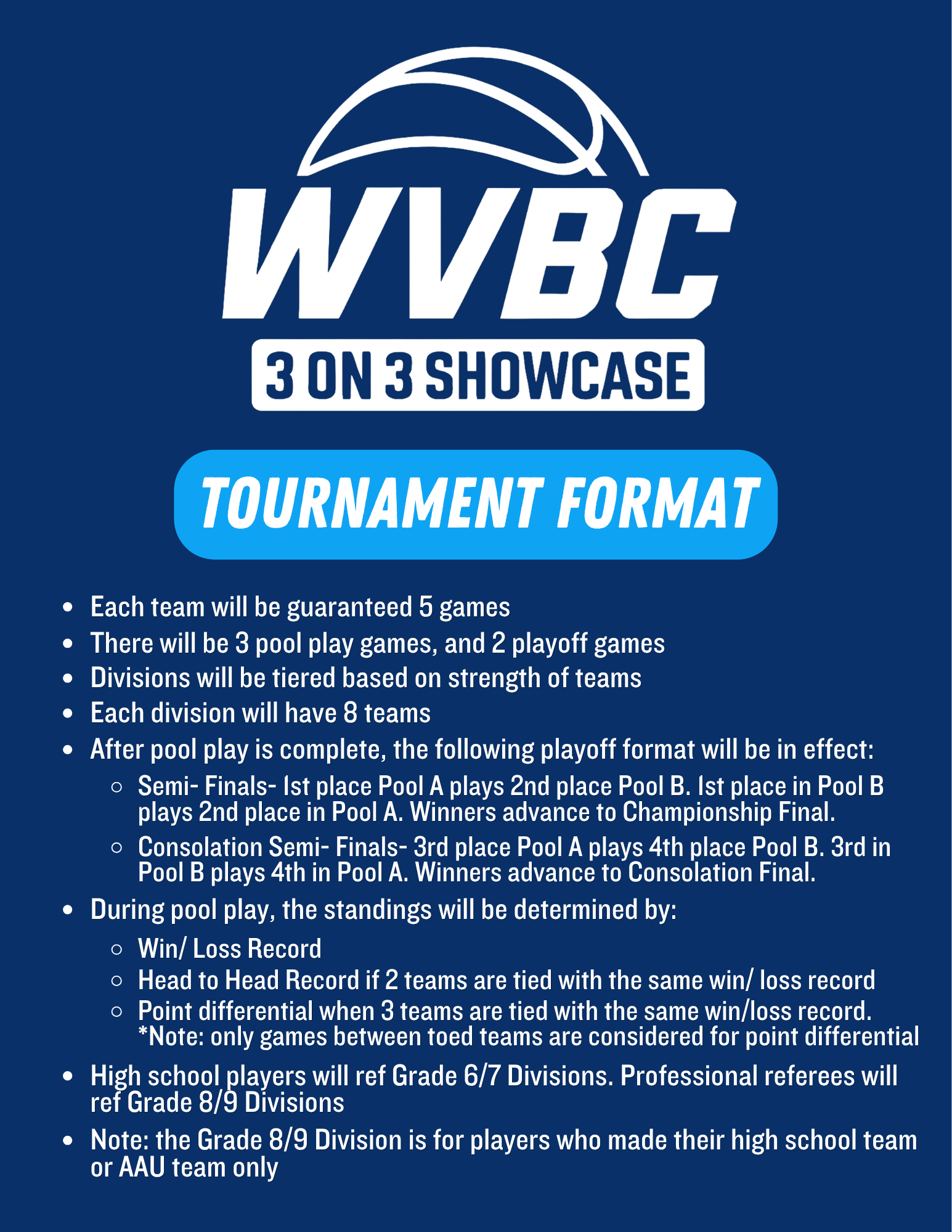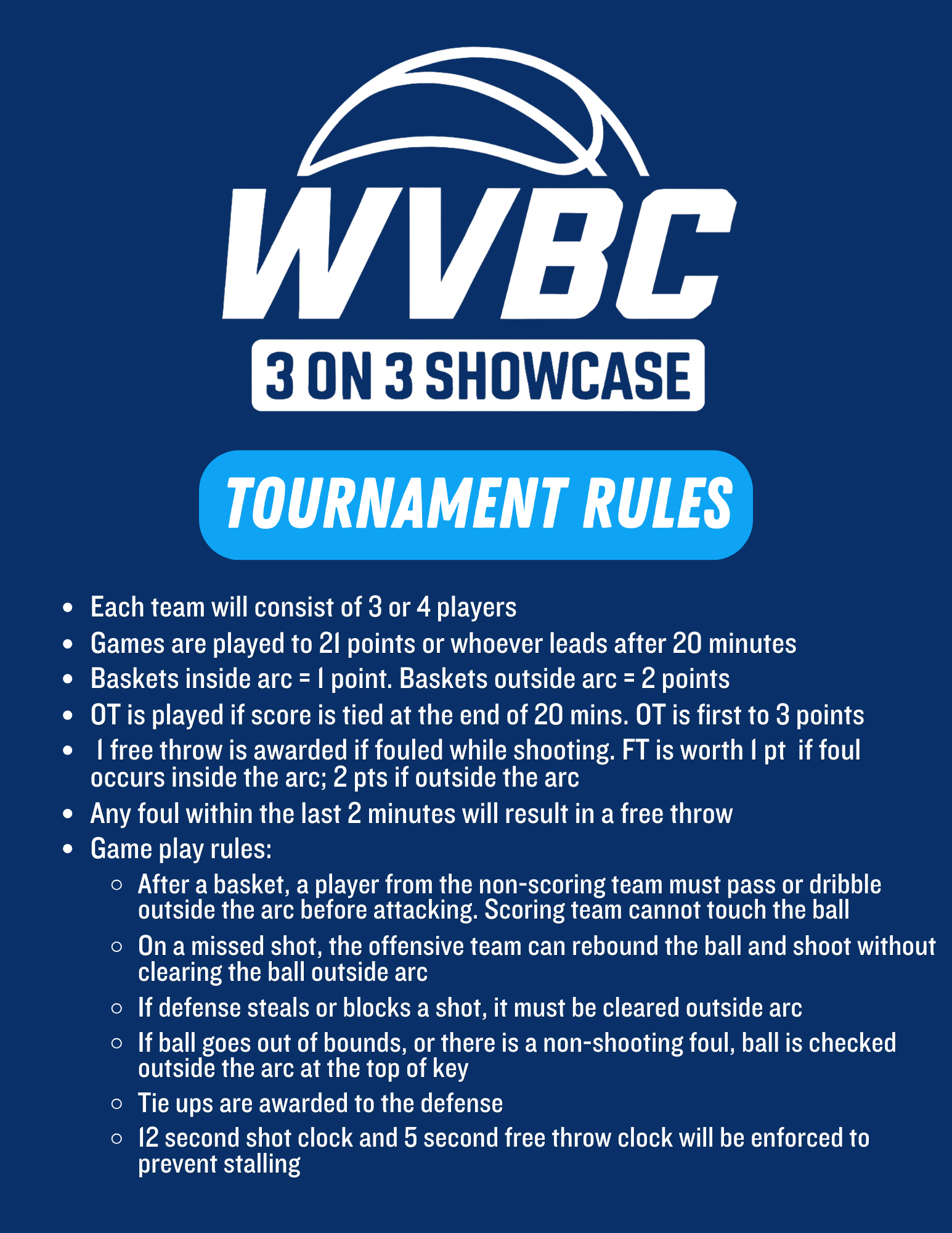 3 on 3 Showcase Click on the images for more info Tournament Flyer Tournament Rules Tournament Format Tournament Schedule Click HERE to register